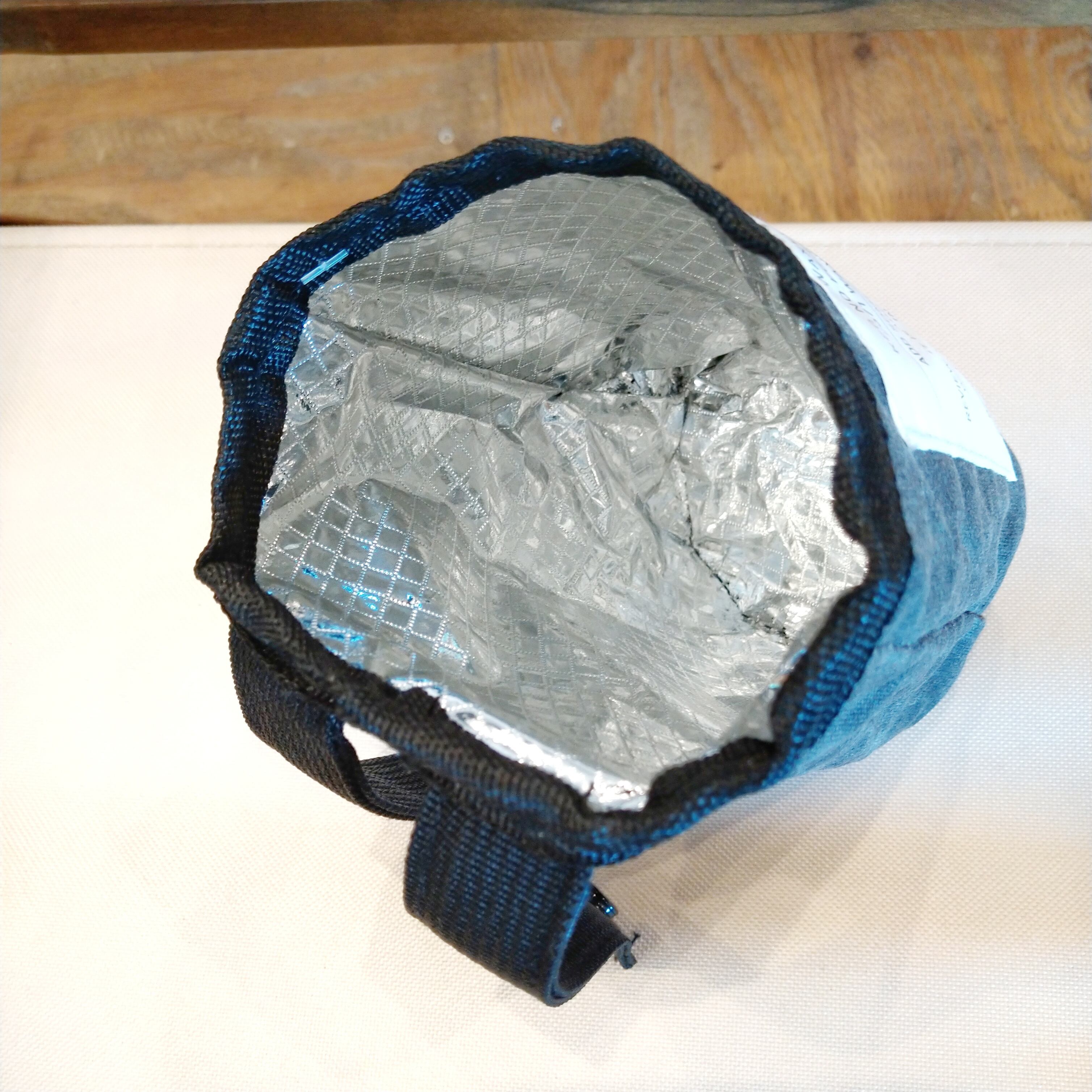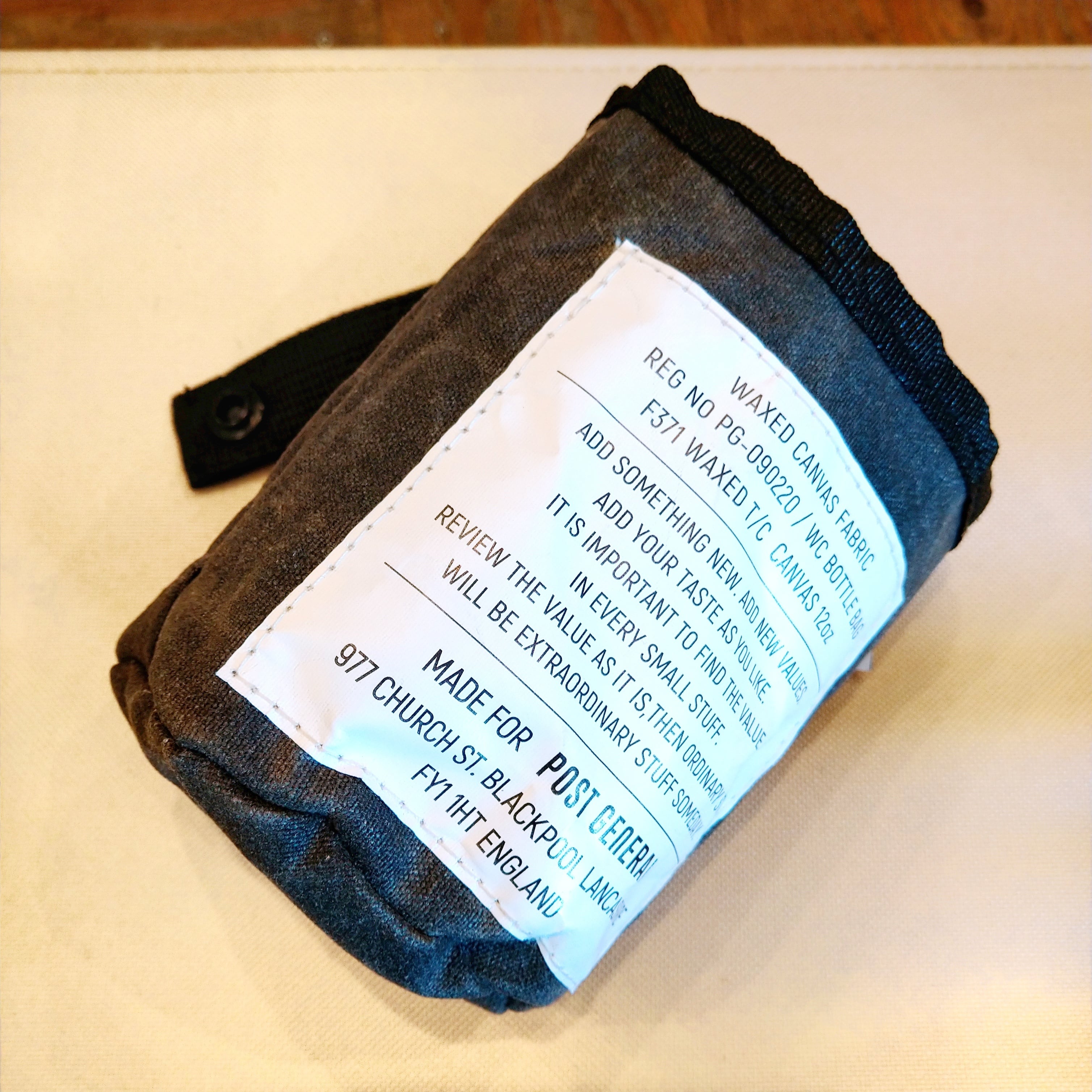 蝋引きのキャンバス生地を使用した、無骨な素材感の際立つ簡易保冷つきボトルバッグ。